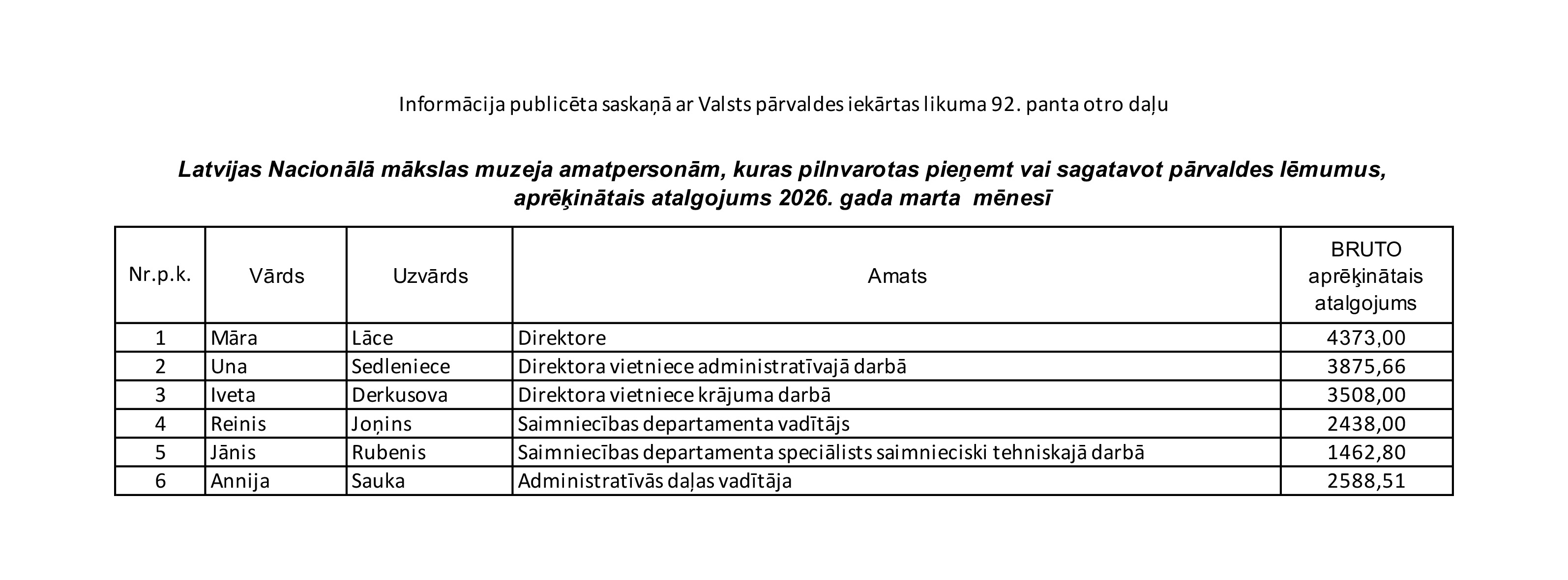 Latvijas Nacionālā mākslas muzeja amatpersonām, kuras pilnvarotas pieņemt vai sagatavot pārvaldes lēmumus, aprēķinātais atalgojums 2026. gada MARTA mēnesī