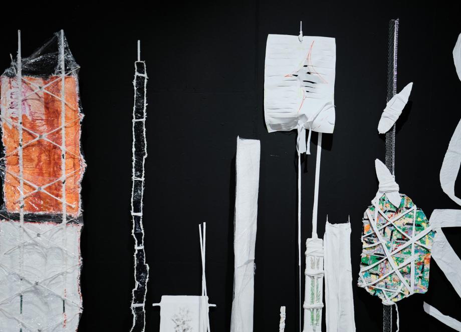 Izstāžu zālē ar marmora kolonnām redzami dažādi mūsdienu mākslas darbi, tostarp gleznas, fotogrāfijas un video ekrāns.